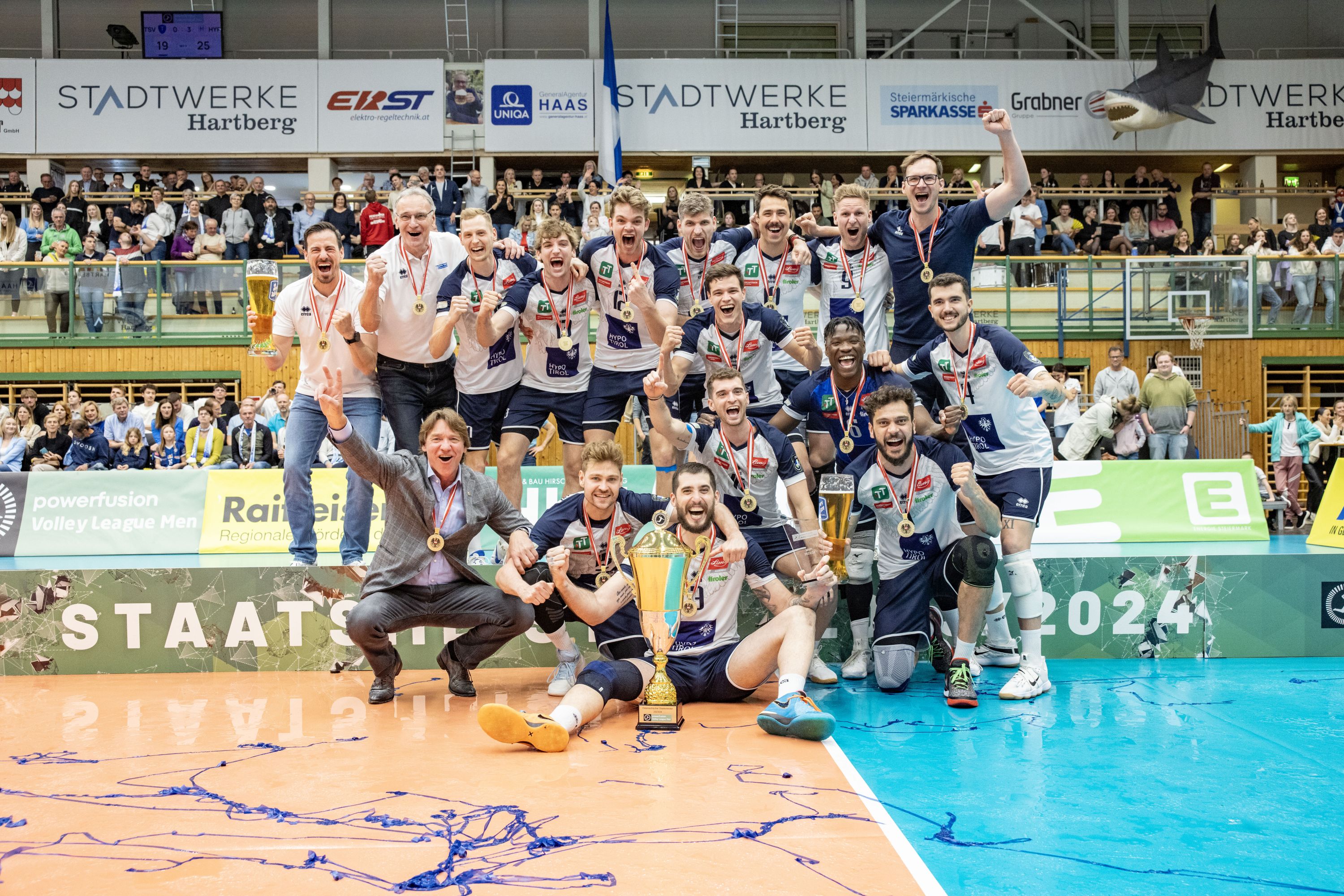 The guests dominated the initial phase in the once again very crowded Stadtwerke-Hartberg-Halle, served powerfully and scored spectacularly. The hosts were initially unable to cause any major troubles to the Tyrolean receivers. However, the home team got going better, blocked strongly, made up for a five-point deficit and eventually took the lead at 17-16. A little later, Hypo Tirol middle blocker Nicolai Grabmüller suffered an ankle injury and Niklas Jeschko came in for him. Despite the shocking moment, the Innsbruck team were the more determined side in the decisive phase of the first set. In the second, HARTBERG could lead for a long time (15-13). However, a service series from Jeschko gave the favourites a 21-16 lead and Hypo Tirol confidently closed this set in their favour as well. The Innsbruck team were unstoppable, dominated the third set and were able to celebrate the successful defence of their title after 85 minutes.