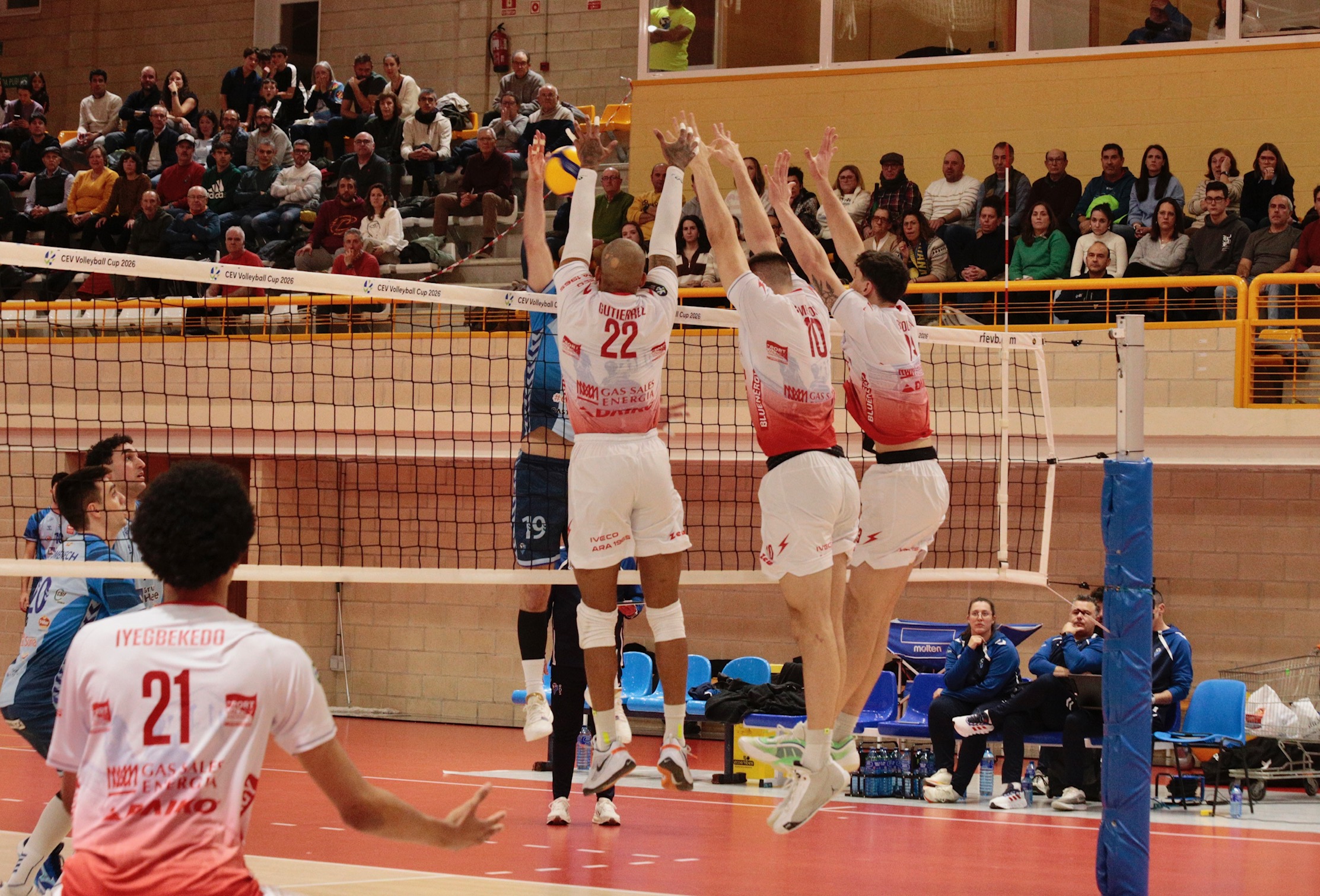 At the start of the match, coach Boninfante opted for a starting line-up including setter Paolo Porro and opposite Bovolenta, middle blockers Francesco Comparoni and Daniel Iyegbekedo, outside hitters Ramazan Efe Mandiraci and José Miguel Gutierrez Suarez, and Luca Loreti as libero. In addition to the absences of Gianluca Galassi and Robertlandy Simon, Henri Leon also did not travel, remaining in Piacenza after catching a cold. The Spanish team responded with Lucas Lorente Lopez and Juan Pablo Moreno Mosquera as setter and opposite, middlemen Joan Domenech Tous and Azzdin Mimoun Chakrani, outside hitters Viktor Lindberg and Omar David Hoyos Mejias, and Arnau Masia Porres as libero.