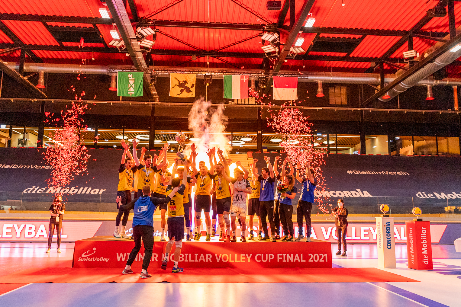 Winterthur, Switzerland, March 27, 2021. TSV JONA Volleyball claimed on Saturday the 2021 edition of the Swiss men’s national cup sponsored by la Mobilière after completing an epic comeback from two sets down in their matchup with Volley SCHÖNENWERD (12-25, 22-25, 26-24, 25-23, 15-12).