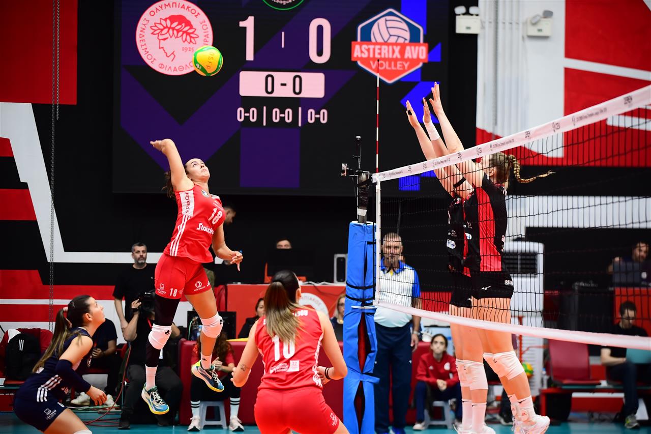 The number of successful point winning blocks of Olympiacos PIRAEUS compared to Asterix Avo BEVEREN.